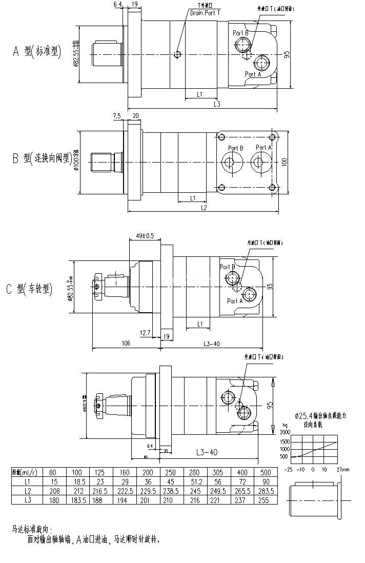 表中數(shù)據(jù)在使用68#抗磨液壓油,50℃ 油溫條件下測試的,不同馬達(dá)結(jié)果略有差別